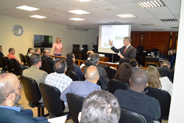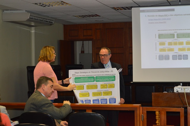 Nesta segunda-feira (19 de outubro) aconteceu o evento promovido pelo Núcleo de Gestão Estratégica da Justiça Militar que deu início à fase de informação e sensibilização do quadro de pessoas da JME/RS em relação ao Planejamento Estratégico da Instituição, concebido em 2015 e com horizonte em 2020. O seminário foi realizado no plenário do TJM/RS com a presença de magistrados e servidores do Tribunal, da 1ª e da 2ª Auditoria localizadas em Porto Alegre. O encontro, aberto oficialmente pelo Juiz-Presidente da Corte Sergio Antonio Berni de Brum, o magistrado que, a partir de 2009 coordenou as atividades e representou a Justiça Militar junto aos diversos comitês do CNJ ligados a práticas de gestão. O evento foi conduzido pelo Juiz-Gestor Estratégico nomeado pelo Juiz-Presidente para o período, Fábio Duarte Fernandes e pelas servidoras do NGE Dionês Gabana de Souza e Simone Maria Picoral Dal Molin. Em breve os alvos do trabalho serão as Auditorias de Passo Fundo e de Santa Maria. A tônica das falas dos magistrados foi a necessidade de compreensão, envolvimento e comprometimento de cada pessoa, o que deve ser transformado em interação sinérgica entre as unidades da Instituição. “O envolvimento e intervenção operacional do conjunto de servidores da Justiça Militar se efetivará por meio da identificação e designação de catalizadores locais encarregados de fazer fluir metodologias unificadas nas atividades setoriais balizadas pelo Planejamento Estratégico, além de representar o grupo junto ao Núcleo de Gestão, órgão que fará o monitoramento da aplicação da estratégia”. Segundo o Juiz-Presidente do TJMRS, “o seminário tem por finalidade promover diálogos sobre temas estratégicos, reflexões e trocas de experiências entre os setores e, principalmente, comunicar a estratégia da Justiça Militar do Estado do Rio Grande do Sul.”