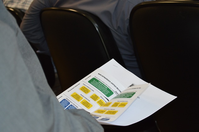Ainda sob o título metodologia, os componentes do NGE explicaram o processo de análise, estruturação e monitoramento de ações estratégicas e projetos relacionados à atuação preventiva ligadas a canais ou meios de comunicação com a sociedade e com os jurisdicionados, convênios, intercâmbios, parcerias e integração de sistemas com outros órgãos e entidades (TIC), facilidade de acesso à justiça, ampliação da competência da Justiça Militar, promoção do interesse da sociedade em conhecer a JMERS, com relevância no controle social e percepção positiva deste controle.