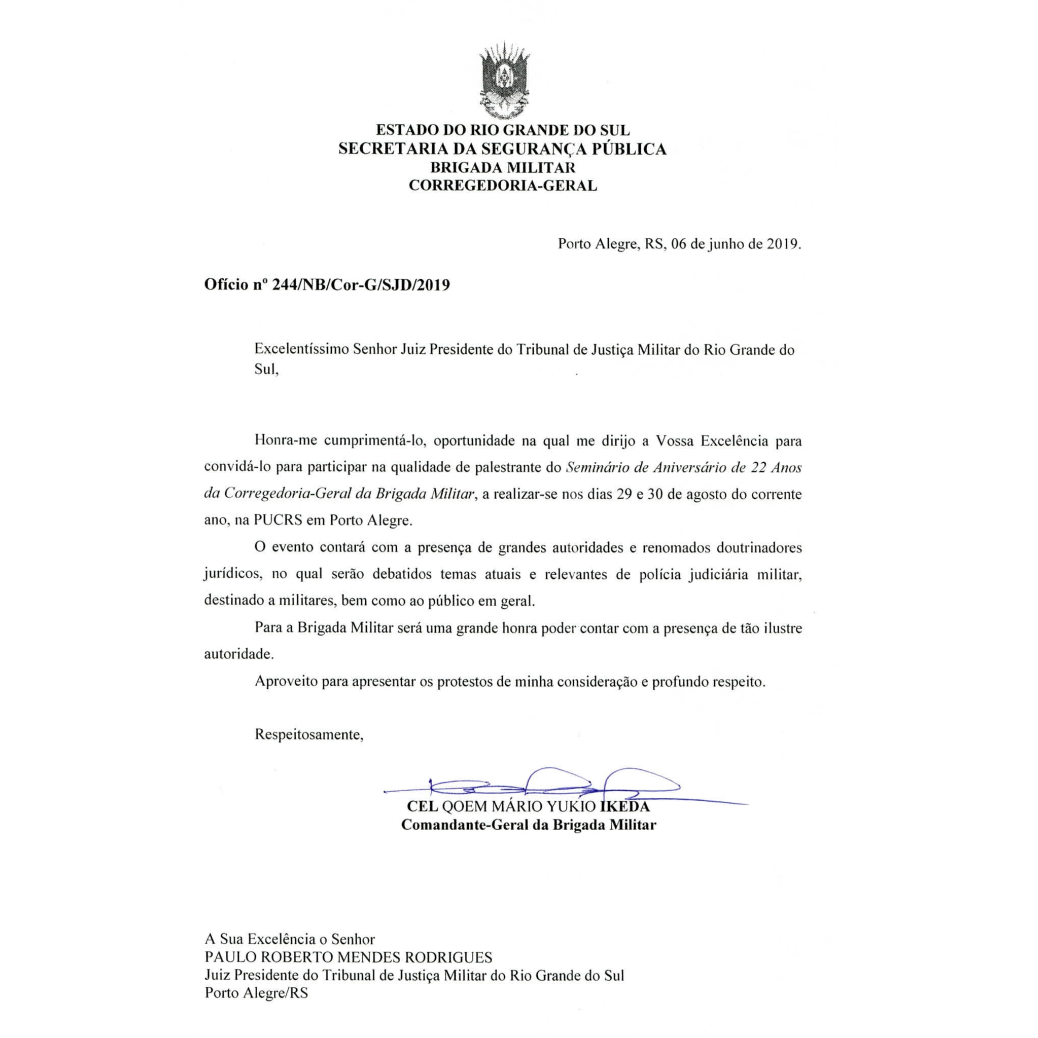 Na manhã dessa quarta-feira (26 de junho), o Presidente do TJM, recebeu um convite formal do Comandante-Geral da Brigada Militar, Cel. Mário Yukio Ikeda, entregue pelo Corregedor-Geral da Brigada Militar, Cel. Márcio Roberto Galdino, para que ocupasse a função de palestrante na celebração de aniversário de 22 anos da Corregedoria-Geral da BM, a se realizar nos dias 29 e 30 de agosto, na PUCRS.