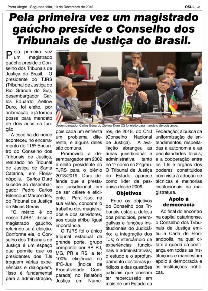 Nessa sexta-feira (07/12), no encerramento do 115º Encontro do Conselho dos Tribunais de Justiça, em Florianópolis/SC, o Desembargador Carlos Eduardo Zietlow Duro foi eleito, por aclamação, pelos chefes dos Tribunais de Justiça de todo país para presidir o Colegiado. O Presidente do TJRS é o primeiro gaúcho a presidir o Conselho dos Tribunais de Justiça, o que orgulha a comunidade gaúcha e engrandece a atuação da Justiça do Rio Grande do Sul.