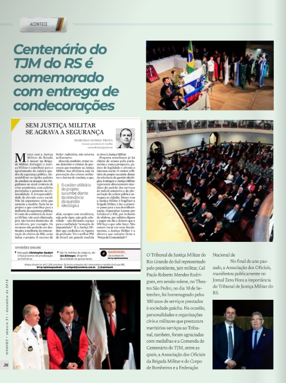 A revista Viva Voz (edição n.º 31 - dezembro 2018) da Associação dos Oficiais da Brigada Militar e do Corpo de Bombeiros Militar publicou notícias referentes à Justiça Militar do Estado do Rio Grande do Sul, trazendo uma breve retrospectiva das ações realizadas durante o ano de 2018.
