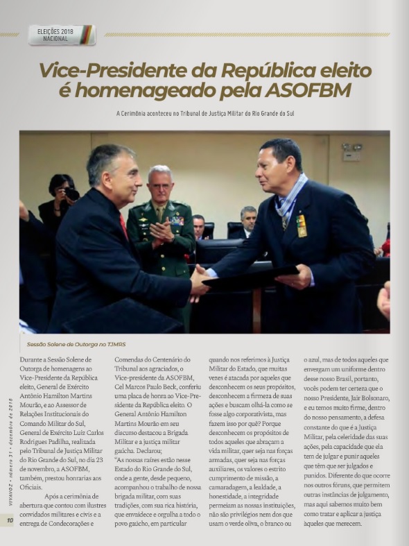 Na edição, foram destacadas a cerimômina de outorga de homenagens ao Vice-Presidente da República, General de Exército Antônio Hamilton Martins Mourão, e ao Assessor de Relações Institucionais do Comando Militar do Sul, General de Exército Luiz Carlos Rodrigues Padilha, realizada no Tribunal de Justiça Militar do Rio Grande do Sul, bem como o evento de comemoração do centenário do TJMRS, celebrado no Theatro São Pedro, no dia 10 de setembro de 2018.