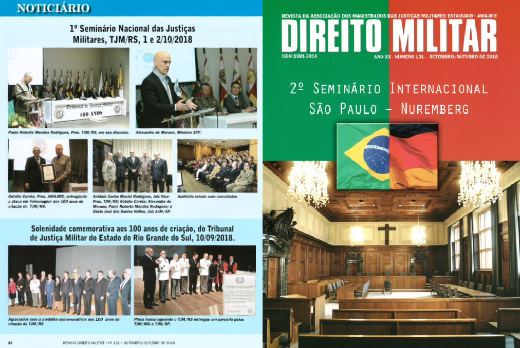 Na edição n.º 131 da Revista Direito Militar foram publicados dois artigos referentes à Justiça Militar do Estado do Rio Grande do Sul, sendo o primeiro referente ao aniversário do TJM/RS celebrado no Theatro São Pedro, ocorrido no dia 10 de setembro de 2018 e o segundo artigo foi referente ao 1º Seminário Nacional das Justiças Militares Estaduais do Brasil, ocorrido no dias 1º e 2 de outubro de 2018.