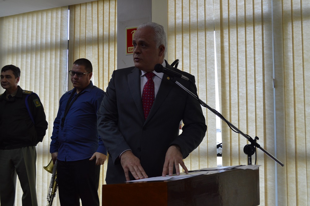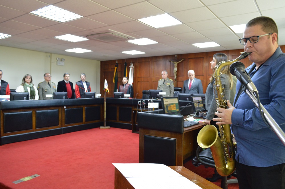 Após, o Sr. presidente do TJM/RS abriu os trabalhos, seguido da execução do Hino Nacional, pelo Sgt. Carlos Roberto Teixeira Kettz.