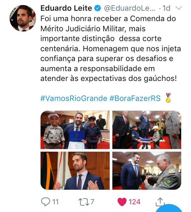 Homenagem que nos injeta confiança para superar os desafios e aumenta a responsabilidade em atender as expectativas dos gaúchos".
