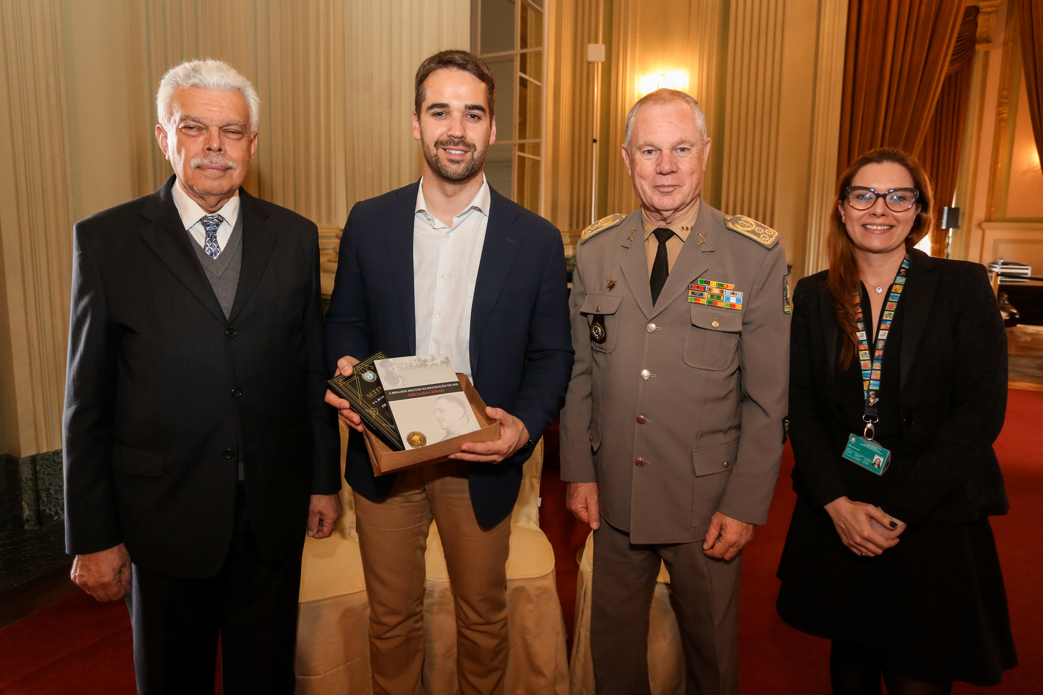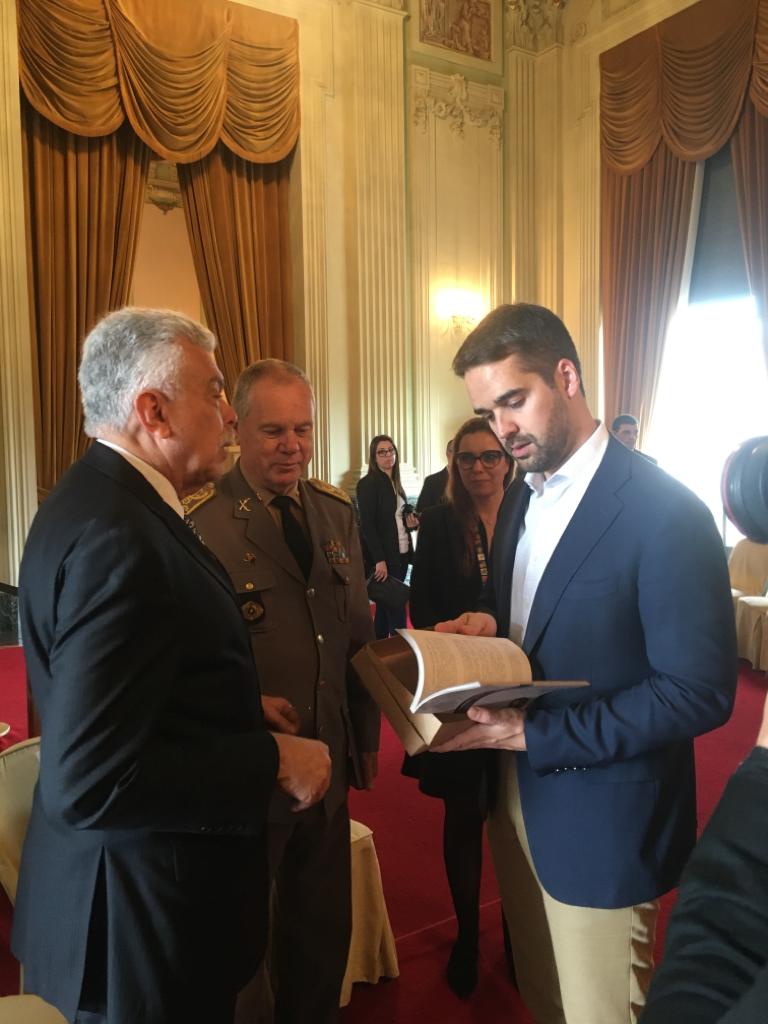Na tarde desta quarta-feira (16 de outubro) no Palácio Piratini, o Presidente do TJM, acompanhado do, Presidente do Instituto Histórico e Geográfico do RS, Professor Miguel Frederico Espirito Santo, e pela Bibliotecária Pesquisadora-Judiciária, Francine Feldens, realizaram a entrega dos livros "Brigada Militar na Revolução de 1923" e “As Auditorias da Justiça Militar do Estado do Rio Grande do Sul” ao Exmo. Governador Eduardo Leite.