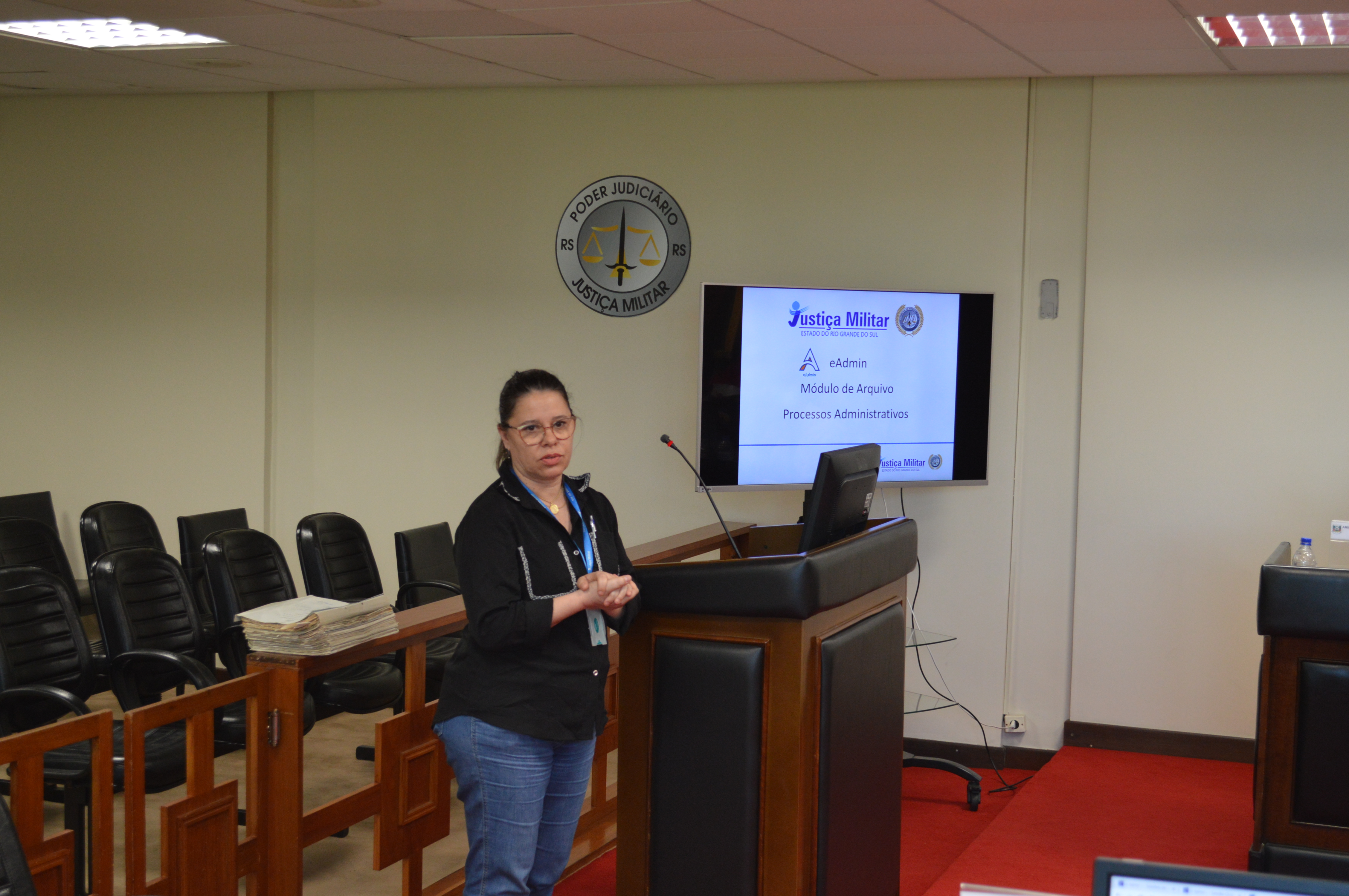 Na tarde dessa quarta-feira (09 de outubro) a Justiça Militar do Estado do Rio Grande do Sul, em Sessão Administrativa, assistiu as explanações, realizadas pela Servidora Elisabete Simões, sobre a digitalização de documentos de guarda permanente referente aos Servidores civis, Militares e Magistrados que passaram por esse Tribunal e inserção no sistema EAdmin.