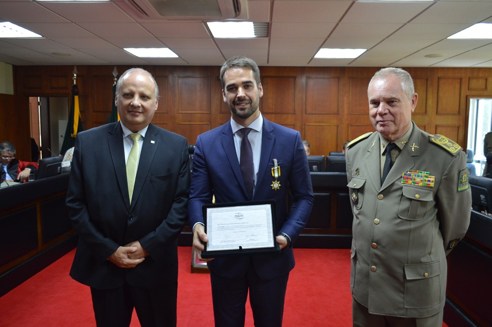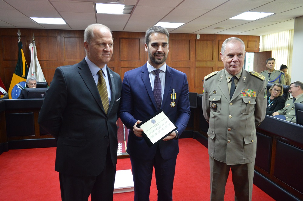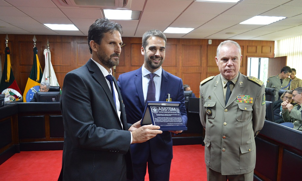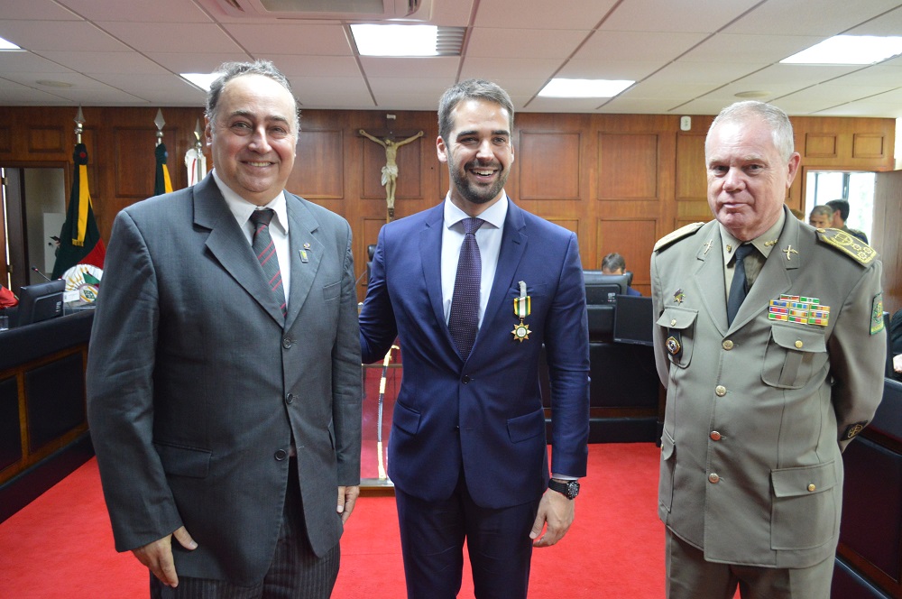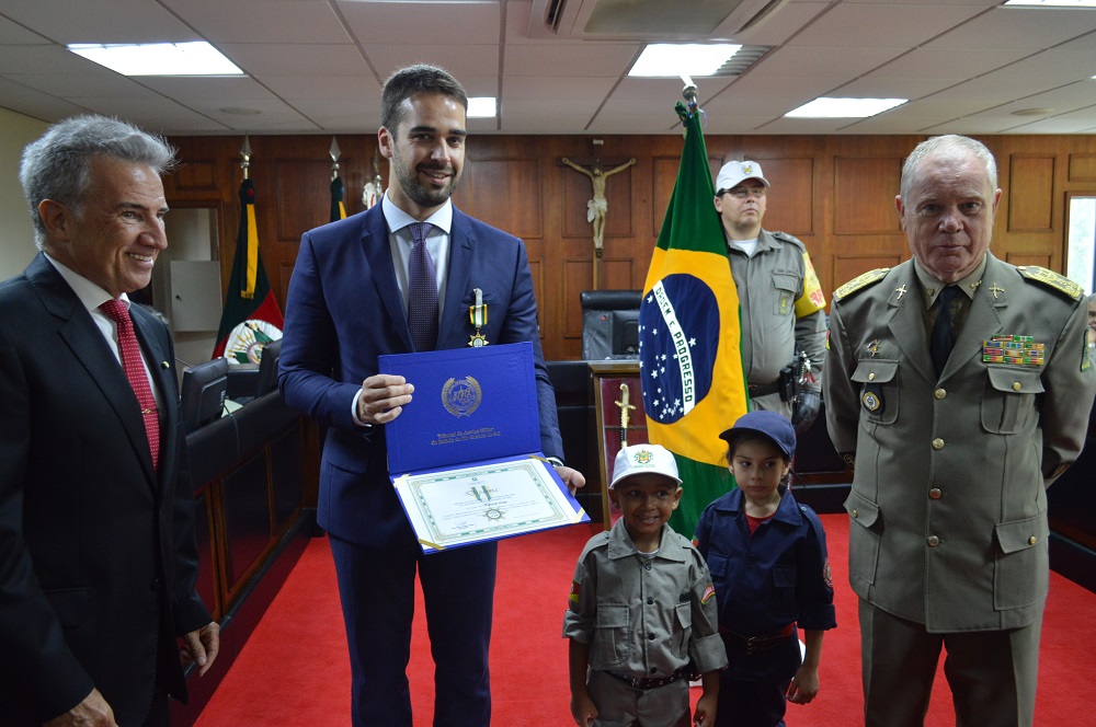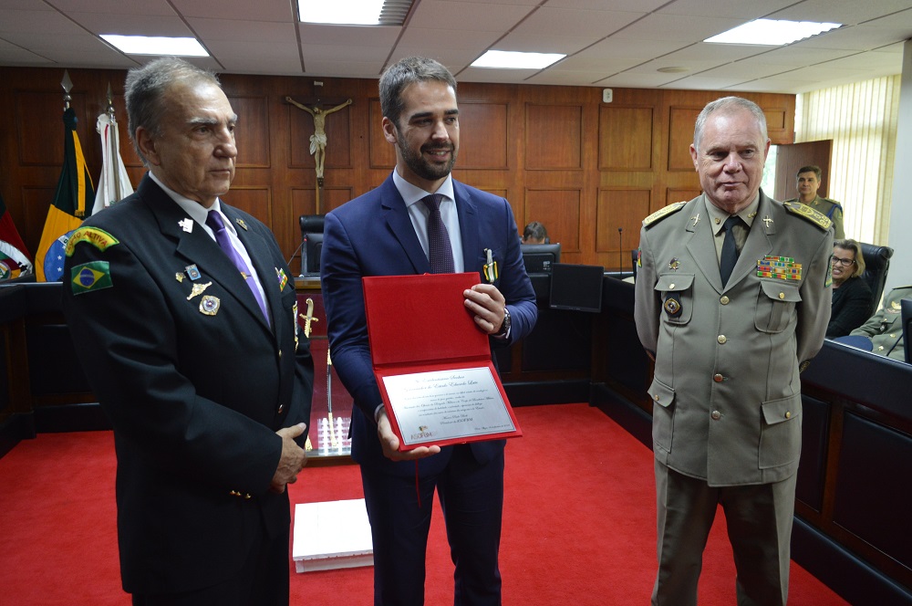 Na tarde desta quarta-feira (06 de fevereiro), a Justiça Militar do Estado do Rio Grande do Sul, em Sessão Solene, outorgou a medalha Mérito Judiciário Militar ao Exmo. Sr. Eduardo Leite, Governador do Estado.