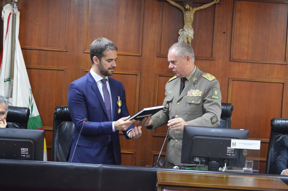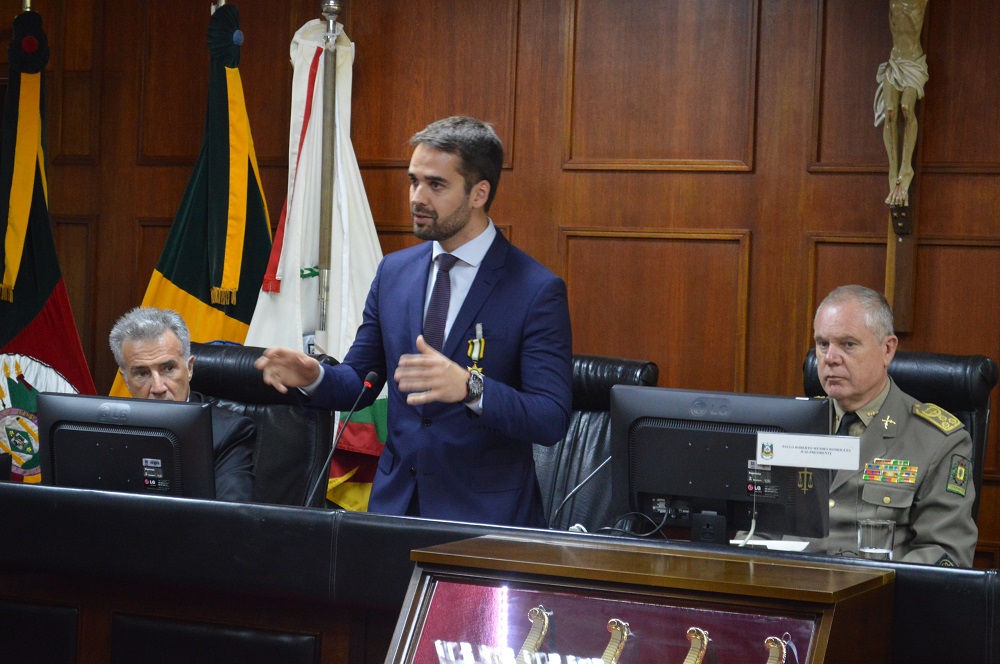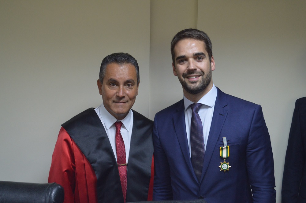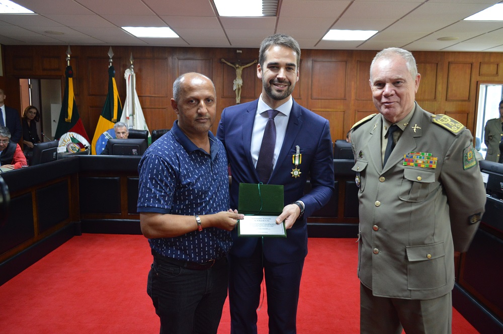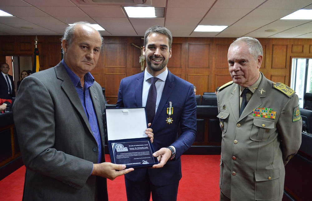 Na tarde desta quarta-feira (06 de fevereiro), a Justiça Militar do Estado do Rio Grande do Sul, em Sessão Solene, outorgou a medalha Mérito Judiciário Militar ao Exmo. Sr. Eduardo Leite, Governador do Estado.