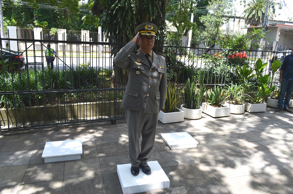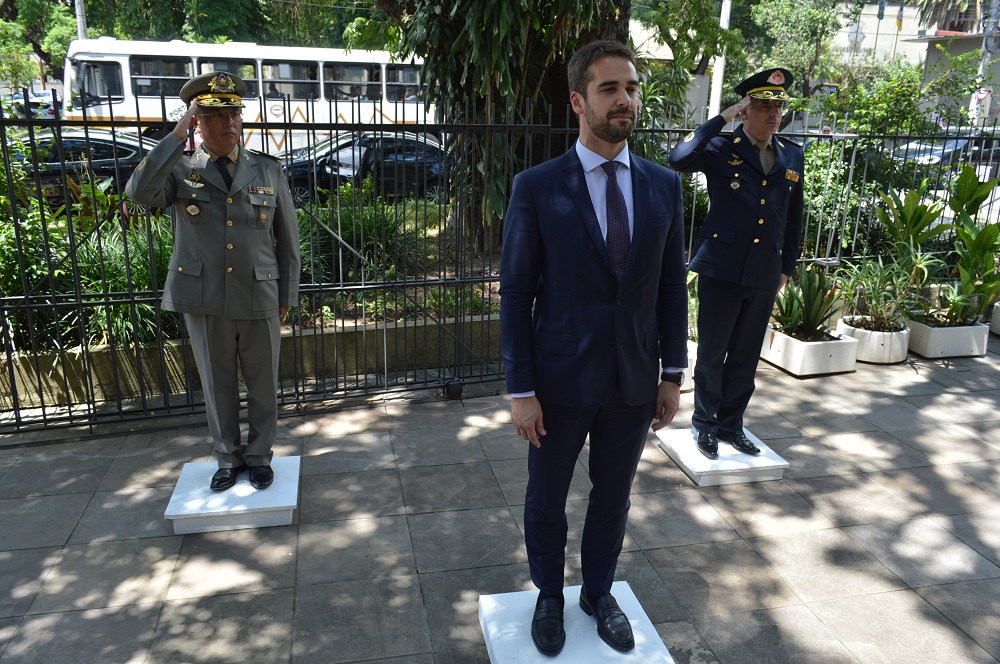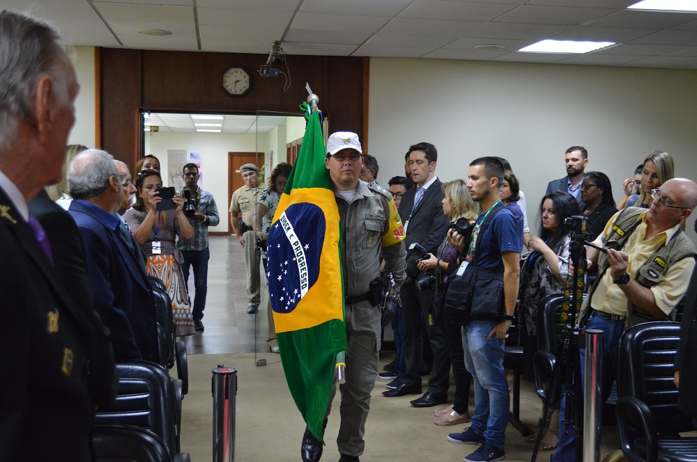 Ato contínuo, a Bandeira Nacional foi conduzida ao centro do plenário, para que fossem realizadas as homenagens.