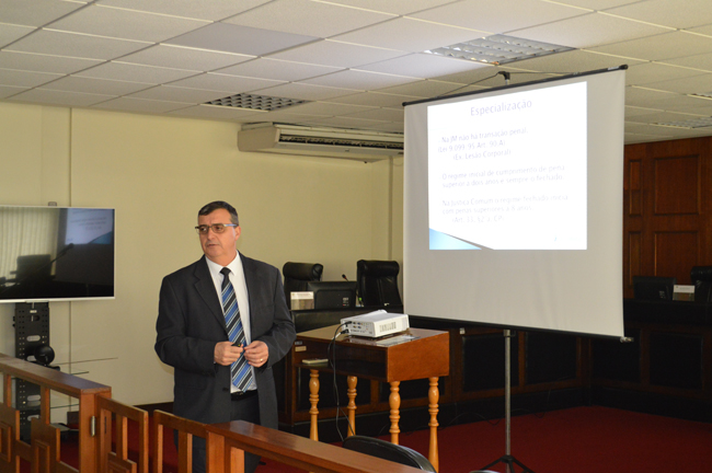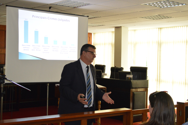 Na segunda parte da palestra, o magistrado apresentou estatísticas e gráficos sobre os crimes julgados no TJM/RS, informando os mais ocorridos. Abrindo espaços para perguntas, Fernandes foi questionado sobre a carreira do direito, o juiz militar disse ser uma função que demanda muita responsabilidade, ainda que seja, segundo ele, muito gratificante. “A carreira que vocês escolheram é necessária, fundamental para a democracia” afirmou.
