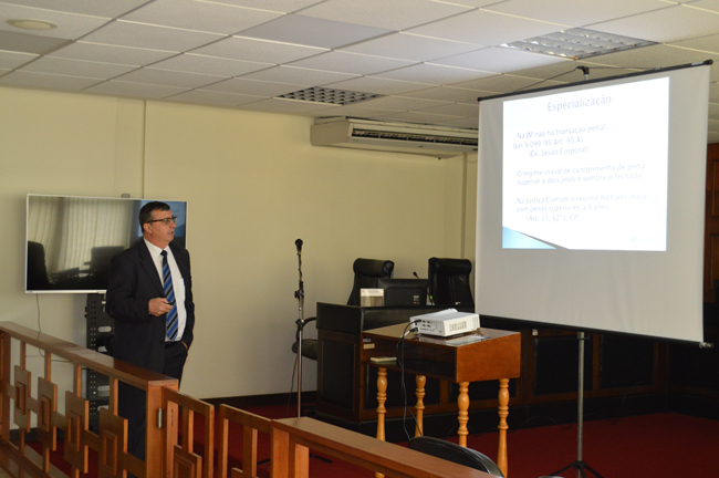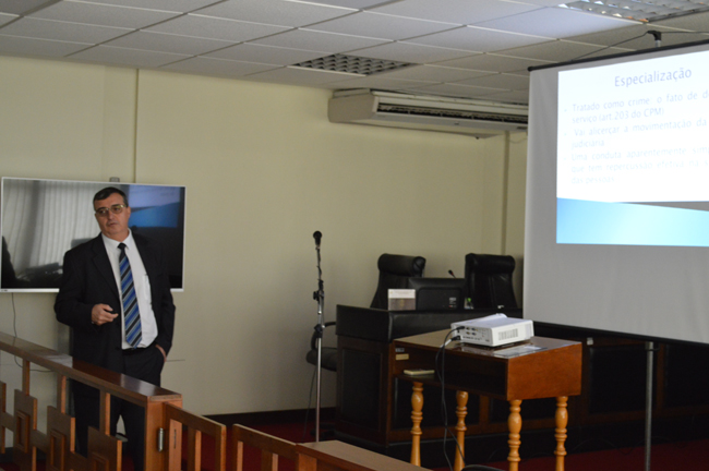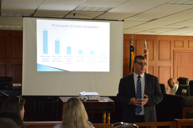 O juiz vice-presidente do TJM/RS iniciou sua explanação apresentando as competências, características específicas e organização da JME, focando na importância da justiça castrense para manutenção dos princípios da hierarquia e disciplina na Brigada Militar. Comentando sobre a rigidez das decisões do Tribunal, o magistrado militar defendeu a necessidade de severidade como medida de controle social dos policiais militares. “Tem que ser assim, são homens que trabalham armados, se eles não tiverem controle social, podem matar uma pessoa”, ressaltou Fernandes.