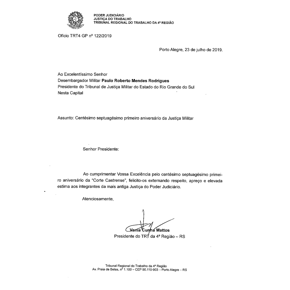 TRT4 parabeniza a Justiça Militar pela passagem dos 171 anos de existência