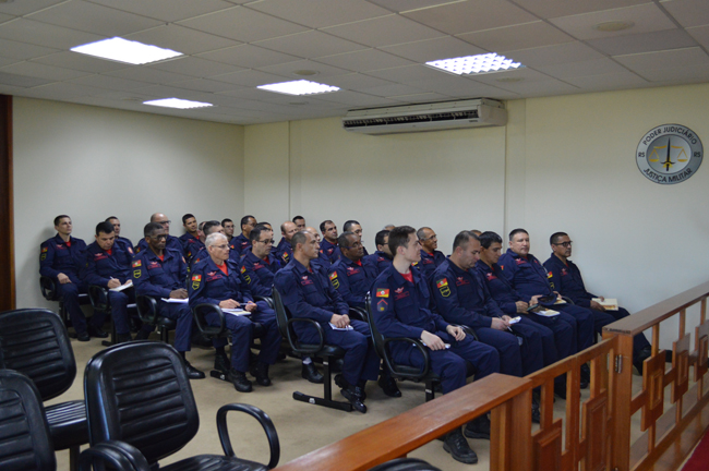Nesta quarta-feira (04 de outubro), antecedendo a sessão ordinária do Pleno da Corte, o espaço do plenário do Tribunal de Justiça Militar foi palco de uma apresentação assistida pela turma de formação de sargentos bombeiros 2017. O tema da fala do juiz Sérgio Antonio Berni de Brum foi “Justiça Militar: História, Competência e Perspectivas”, evocando as raízes da Justiça Militar e sua atuação nos dias de hoje. Além disso, o juiz expôs a importância da justiça castrense para o bem da sociedade e a manutenção da ordem.
